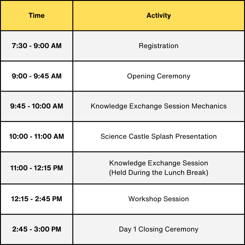 Note: There will be no poster setup on Day 1, as the venue will be cleaned by the co-organizer team prior to the next event following Science Castle. Therefore, all teams are encouraged to print an A4 version of their poster for use during Day 1 of the program and to bring their A1 poster on the following day - Science Castle Day 2 for setup and posting.