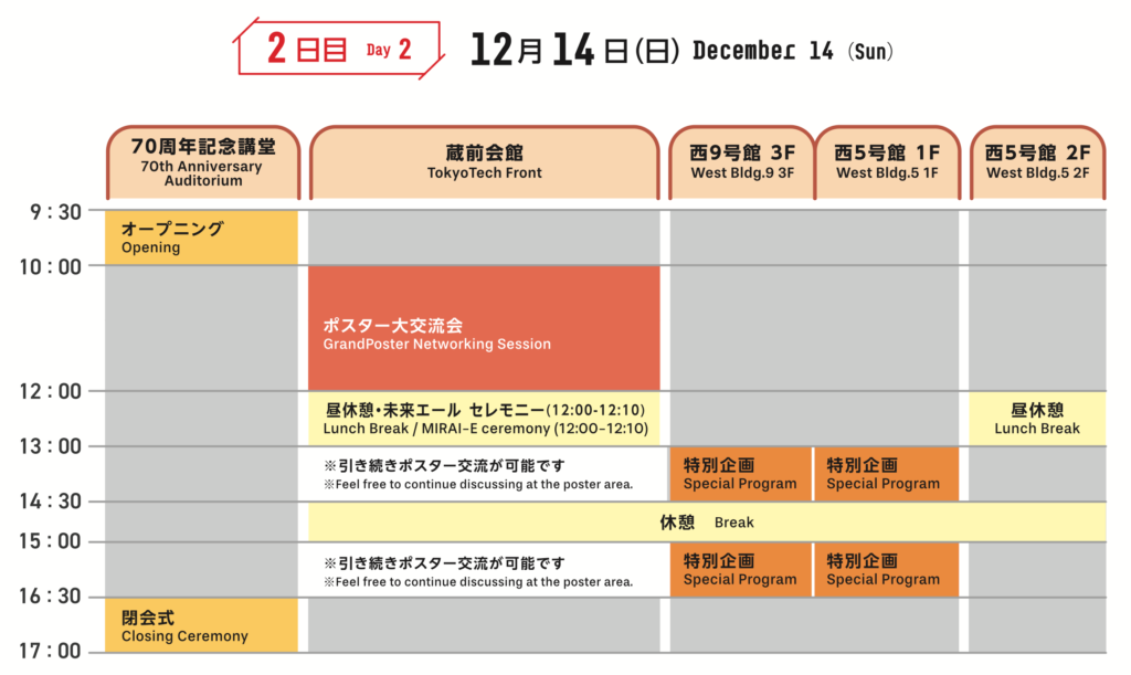 There is a cafeteria on campus, but food and beverages are not allowed. The University has kindly agreed to prepare lunch for a limited number of 250 people. The price is 500 yen/person, courtesy of the university. We would appreciate it if you could bring enough change for the lunch. Please note that we expect about 500 people per day to attend the event, so we cannot prepare enough for everyone. If you do not use the cafeteria, please use the benches in the poster/booth area, on campus (outside the building), or at nearby restaurants.